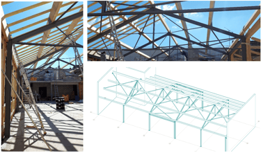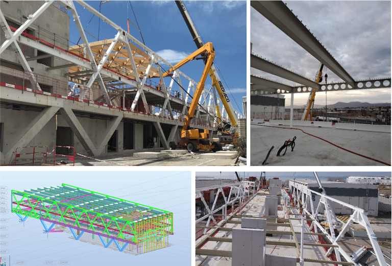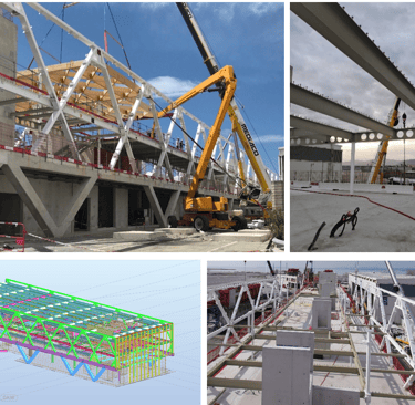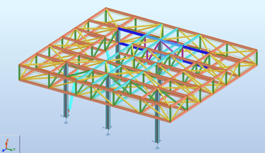 (Vue du modèle de calcul - ROBOT) En collaboration avec : Eiffage métal En phase d’exécution, Bâtiment acier-béton-bois, calculs sections et assemblages, sections tubulaires, plancher mixte acier-béton, poutres alvéolaires.